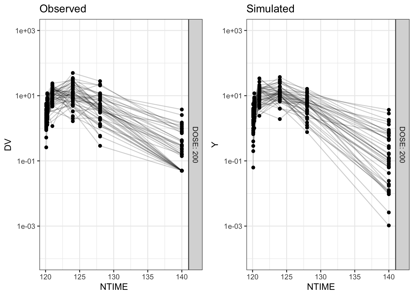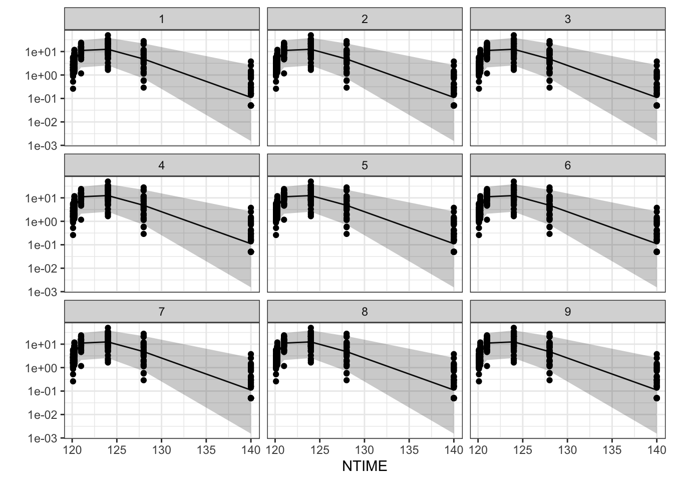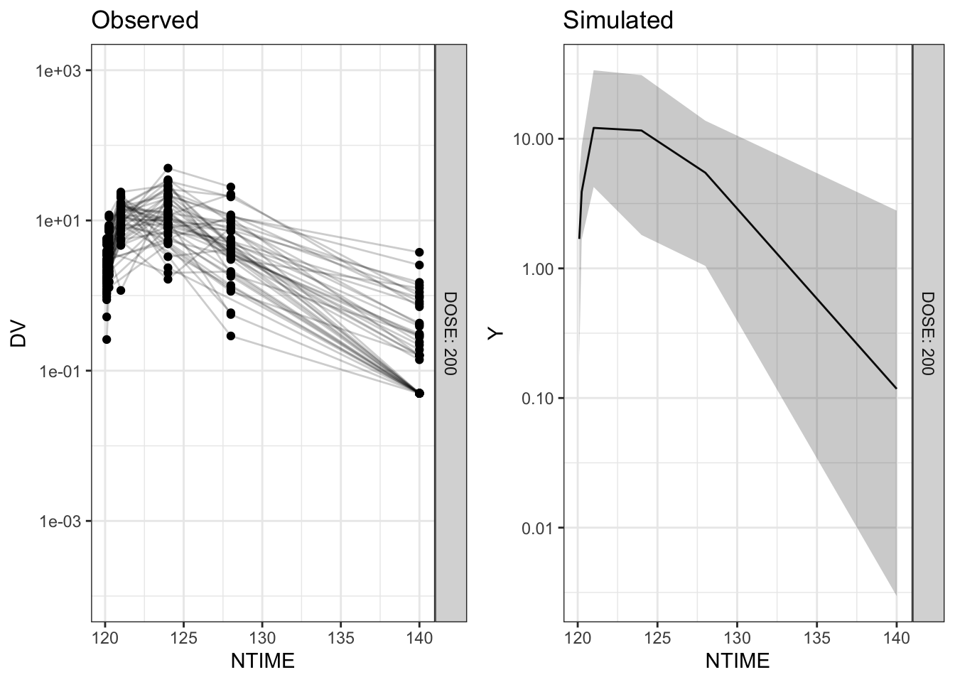 .x=NTIME, .yobs=DV, .ysim=Y, .facet=DOSE,