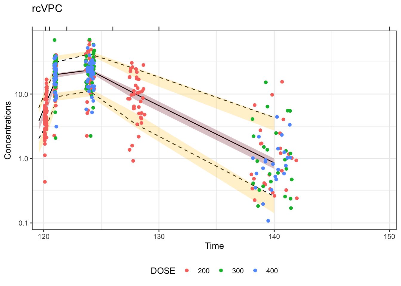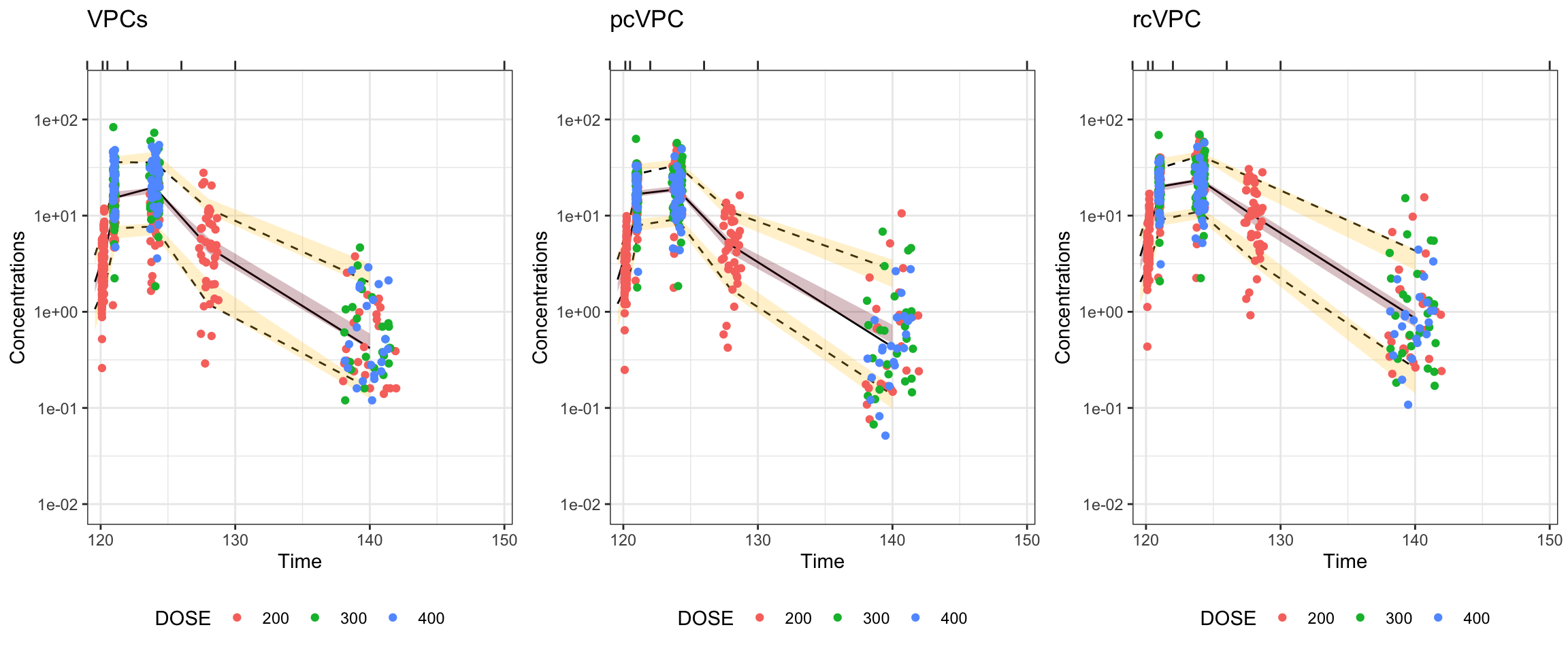 Compare VPC, pcVPC and rcVPC side by side. We can see reference-corrected VPCs have a more natural appearance similar to the shape of the original PK profiles despite the presence of multiple dose groups with different sampling schemes.